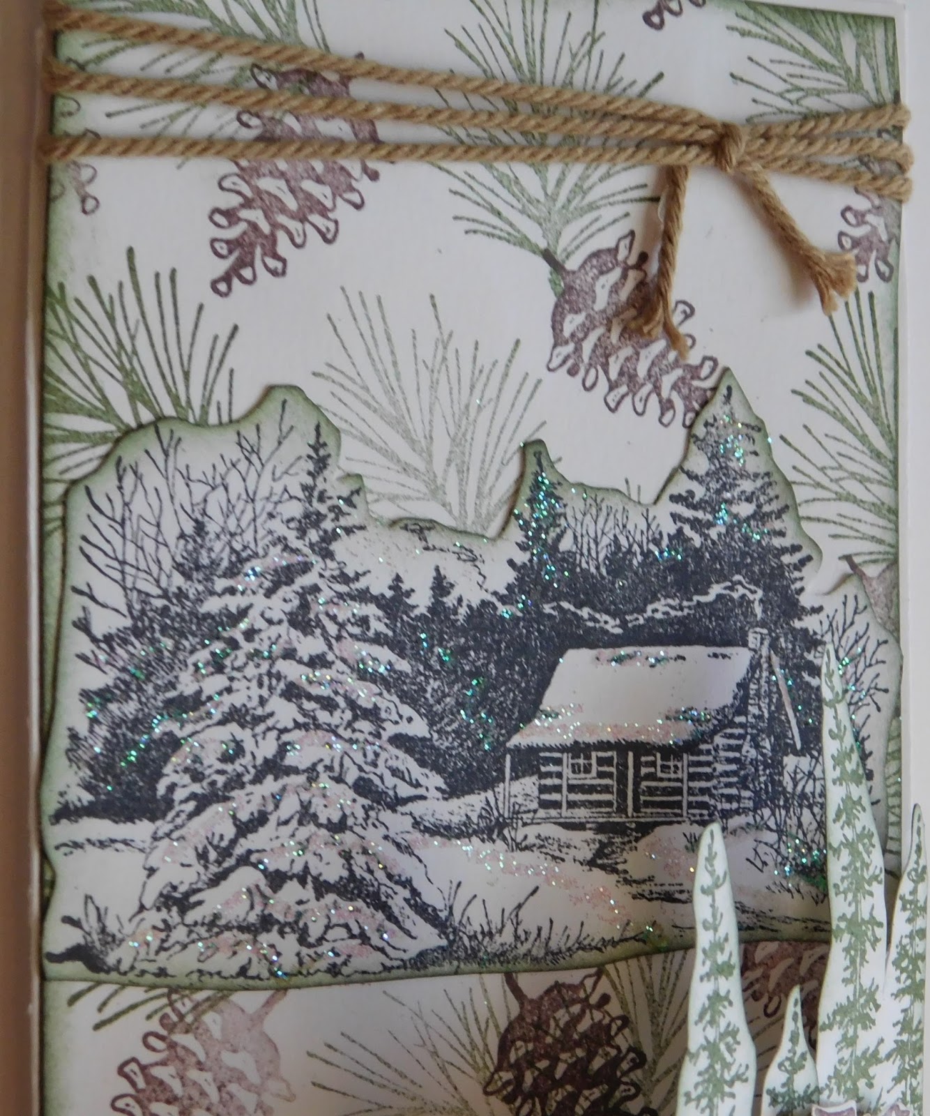 Hello friends, today's card that I'm showcasing is what I like to refer to as my little cabin in the woods. However you can clearly see on this card, I have not mastered the "less is more" concept. I used a standard size piece of paper and just folded it a bit different. I tried to take a few different angled pictures so you could get the idea. Of course after the picture was taken and only then do I realize things I should have tried, or done differently. Perhaps someday I will get it right.. all the more reason to keep popping back in at my blog, to check my progress. ☺ I think my favorite part on this card besides the obvious for me.. moose, pine cones, cabin, is the little clip.. did you spot it? I think it is darling. I only had one. and it just worked lovely to hold this card together.
