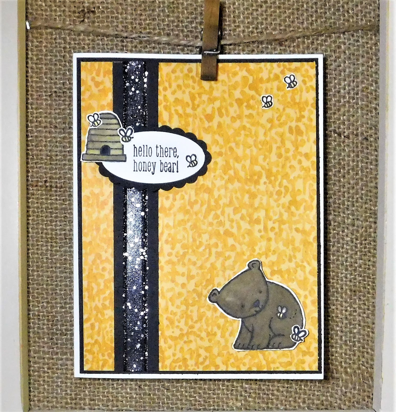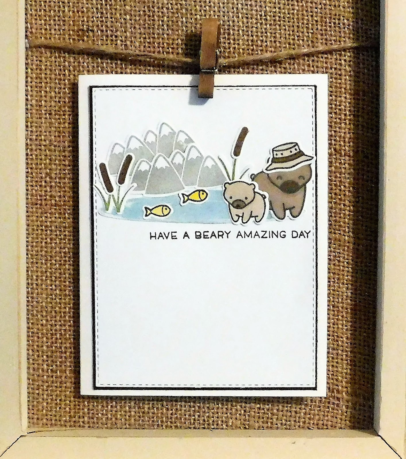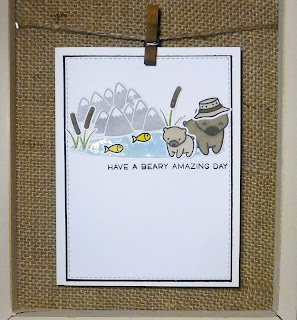 I hope you can see the elements that represent the sketch. I will do my best to share my thoughts when I came across this sketch. Of course at first I thought of the obvious, like perhaps a book shelf, with books stacked every which way. Then I remembered I wanted to make a card for dad. That way I will have it on hand and ready. SO my friend, the pond represents the bottom horizontal line, the two diagonal lines are the mountains on the left hand side, and lastly the two right hand rectangles are the papa bear and baby bear, the fish and cattails are just fillers. I also added some glossy accents to the pond. Then sentiment fit just perfect under the cute little snapshot I created with my Lawn Fawn, Dad and Me stamp set.