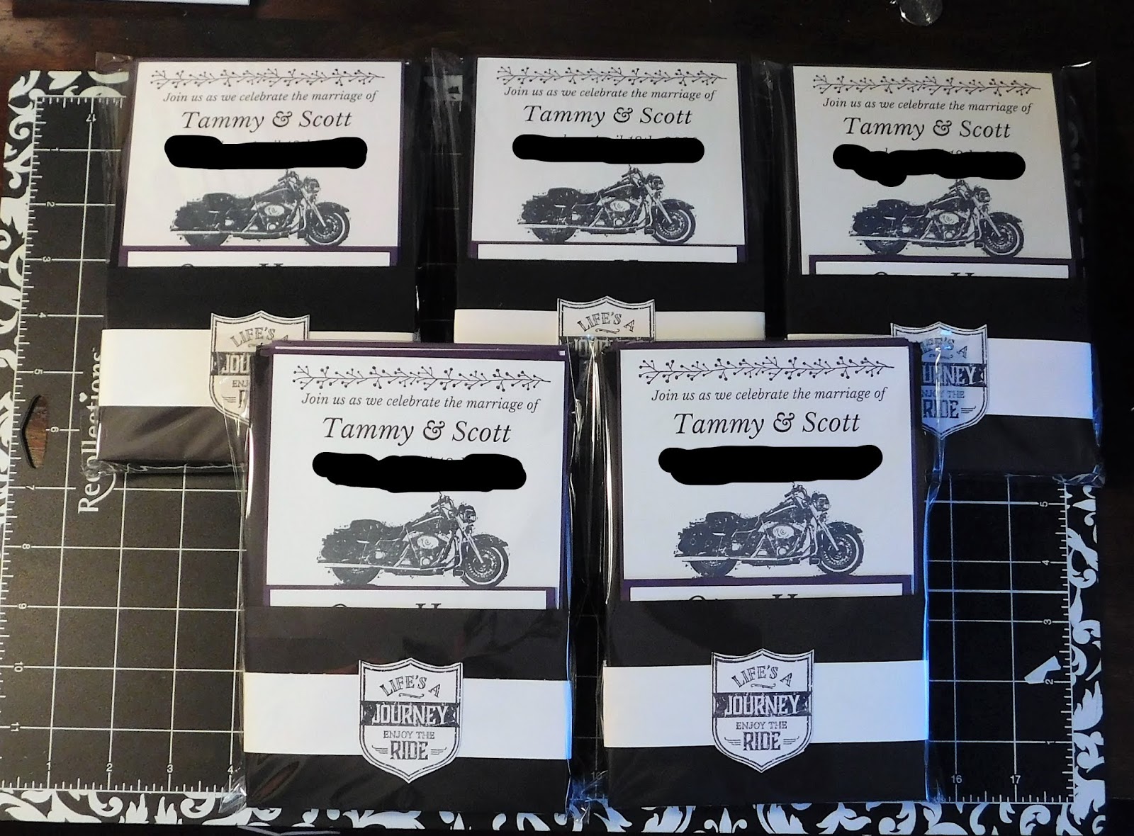 Finally I am done with the wedding invites for a friend. I hope she will LOVE them. I'm sorry but I had to scribble out the information to keep things private for the lovely couple. I wanted the invite to be symbolic of who they are as a couple. They are amazing people, Huge hearts, super generous, Harley riders, photographers, both work in the health care profession. It was an honor to make these for them. I hope to have captured a bit of who they are with these invites. The belly band can slide off to reveal the invite and open house card, or you can just lift them out from the top. I purposely cut the black card stock down a bit so you could more easily pull the invite out, without to much of a struggle. I really liked how they turned out. Cool and yet Classy, with a Black tie, kind of feel.